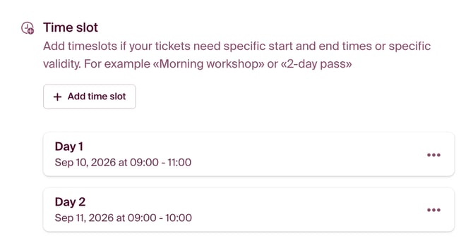 Below you can see which time slot will be displayed on the ticket. If you don’t select a custom time slot, the event’s main time will be shown on the ticket by default.