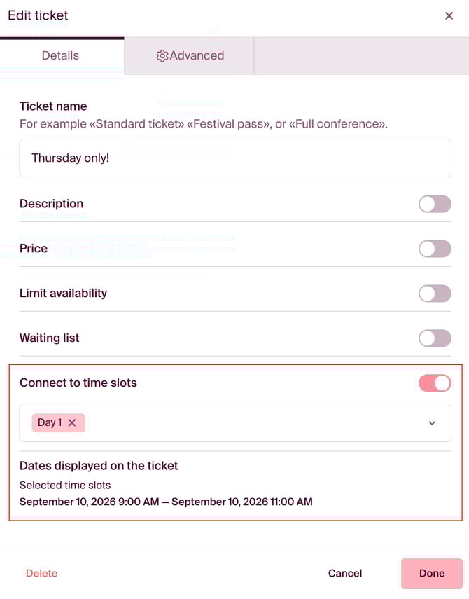 In the event Setup, in "Tickets", you can link your tickets to the time slots you created in the previous step.