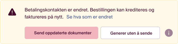 Eventuelt kan dere generere oppdaterte dokumenter uten å sende til kunden, eller la bestillingen være urørt. Skjer det andre endringer på bestillingen som krever kreditering eller ny faktura, vil dette kreve full kreditering.