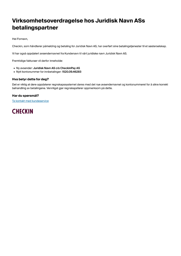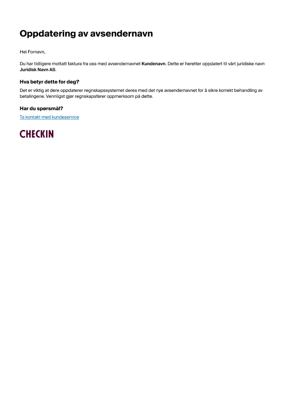 Hvis juridisk navn avviker fra kontonavnet, og mottakeren tidligere har mottatt faktura fra dere i Checkin, vil mottakere få et følgebrev i faktura-PDFen som forklarer endringen.