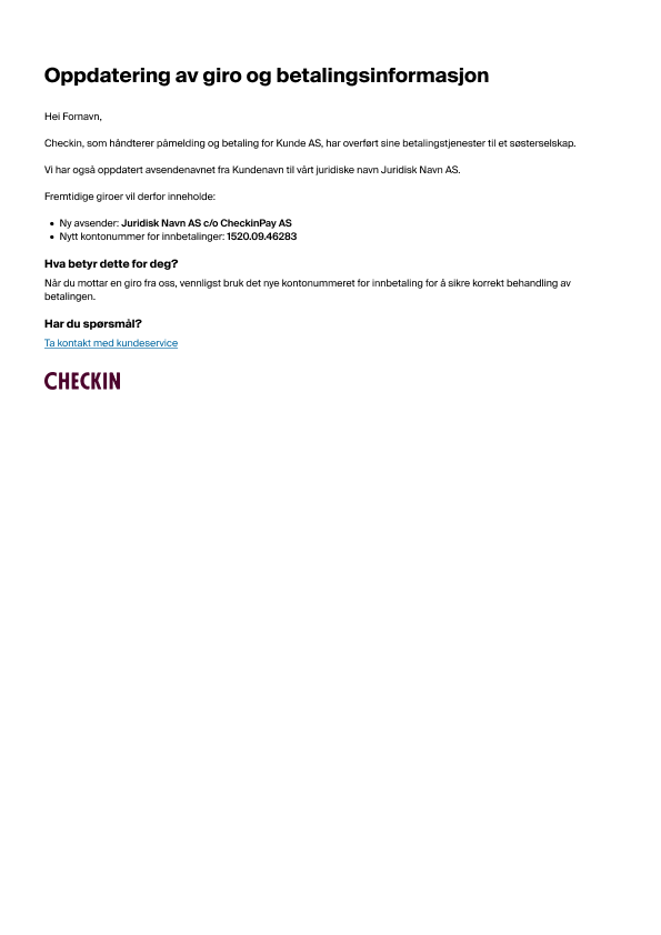 Noen fakturaer ville allerede inneholdt et følgebrev om at det faktureres med CheckinPay AS sitt kontonummer, ikke Checkin AS som tidligere. Disse oppdateres med teksten avsender, der det gjelder: