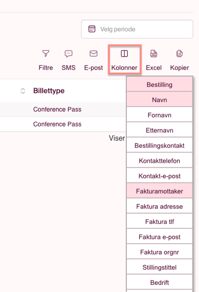 Ved å bruke “Kolonner” kan du sortere deltaker listen basert på den spesifikke informasjonen du ønsker å vise i rapporten. I kolonnefeltet kan du velge ulike felt knyttet til kjøperen og deltakeren. Tilleggstjenester og overnattingsalternativer kan ikke velges i kolonnene. Etter å ha valgt ønskede kolonner, kan du laste ned en Excel-fil ved å klikke på Excel-ikonet.