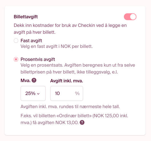 For å dekke Checkins gebyrer kan dere angi en billettavgift som legges på toppen av billettprisen. Denne kan entes settes som et fast beløp per betalte billett, eller som en prosentvis andel av billettprisen. Prosentvis billettavgift er særlig nyttig hvis et arrangement har stor spredning i billettpriser.