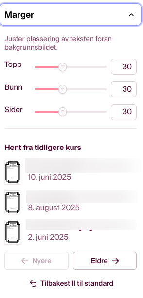 Det er også mulig å hente frem kursbevis man har brukt ved tidligere kurs og bruke det samme, eller å gjøre små endringer. Disse kan hentes frem nederst i menyen på venstre side.