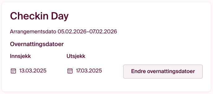 Hvis du for eksempel vil gi deltakerne mulighet til å overnatte en dag før eller en ekstra natt etter arrangementet, kan du enkelt legge til dette ved å klikke på "Endre overnattingsdatoer". Klikk videre på "+1 dag før" eller "+1 dag etter".