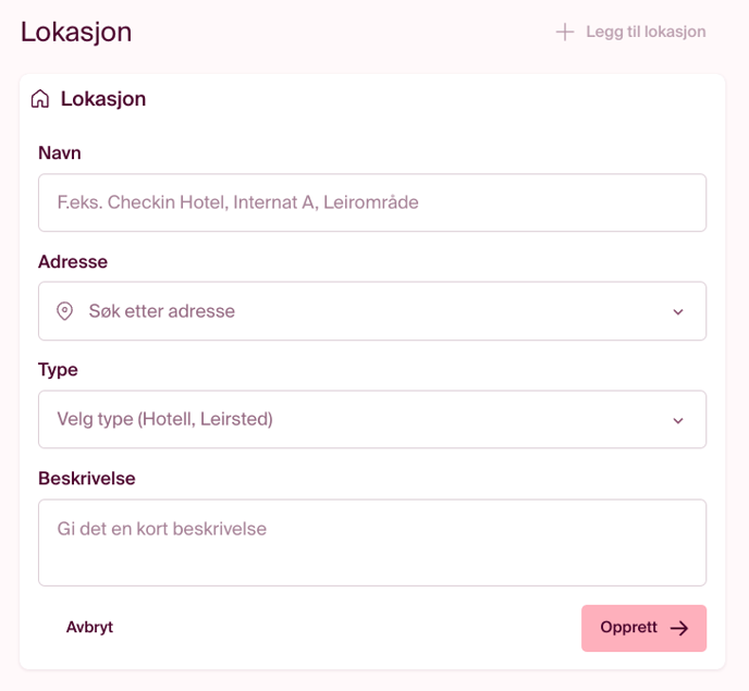 Trykk på knappen "+ legg til lokasjon". Her kan du legge inn spesifikasjoner for overnattingsstedet du skal benytte.