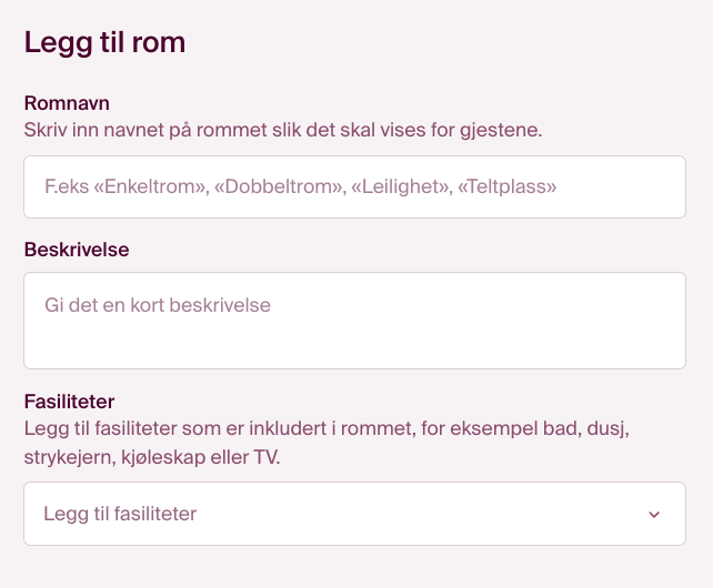 Nå kan du legge til rom og eventuelle romtyper som er tilgjengelige ved overnattingsstedet. Dersom du har en leirplass eller camping, kan du spesifisere enhetene under "Romnavn". Eksempler på dette kan være teltplass, hytte eller plass for campingvogn.