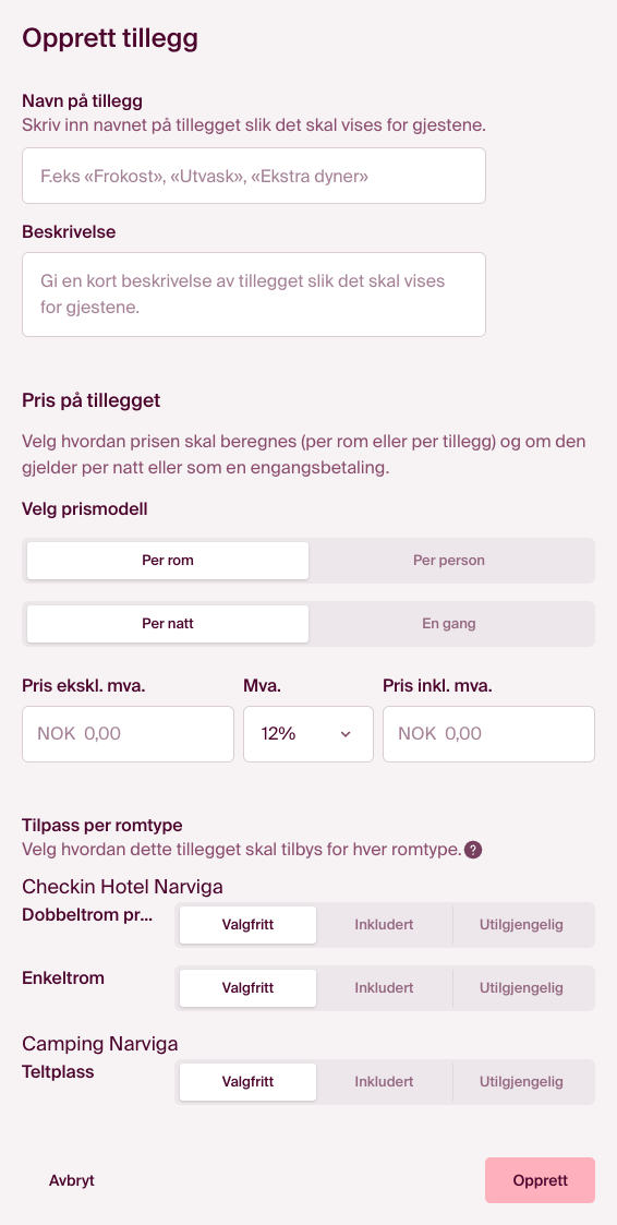 Trykk på "+ Legg til tillegg" for å begynne. Her kan du spesifisere detaljene for tilleggstjenesten, inkludert valg av prismodell, på samme måte som for romtypene. Vurder også om dette tillegget skal gjelde for alle overnattingslokasjonene du tilbyr i forbindelse med arrangementet, dersom du har flere alternativer tilgjengelig.
