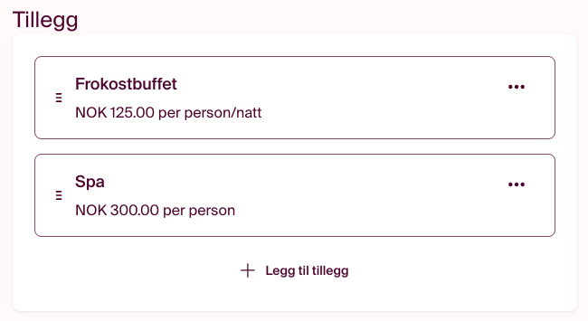 Når du har fylt ut alle detaljer om lokasjonene, kan du gå videre til eventuelle tilleggstjenester. Tillegg kan inkludere frokost eller andre betalte tjenester med varierende merverdiavgift, som for eksempel tilgang til strøm på campingplasser eller bruk av treningsrom på hoteller.