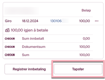 Hvis en kunde ikke betaler fakturaen sin, og det er liten eller ingen sjanse for å få pengene, kan virksomheten tapsføre fordringen. Dette innebærer at fordringen fjernes som en eiendel og registreres som en kostnad i resultatregnskapet. Dette kan du også gjøre enkelt i Checkin.
